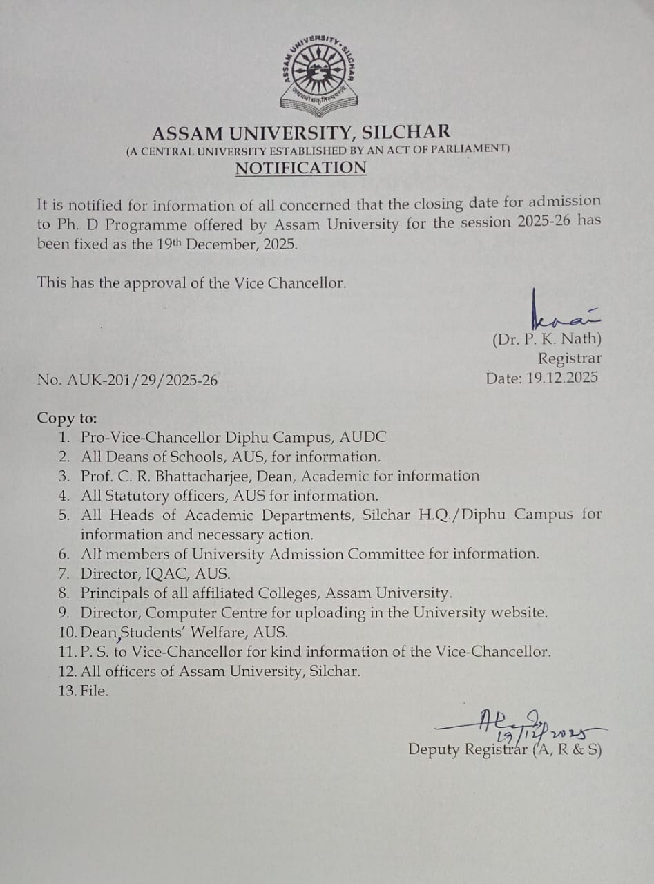 Notification regarding closing date of Admission to PhD Programme offered by Assam University