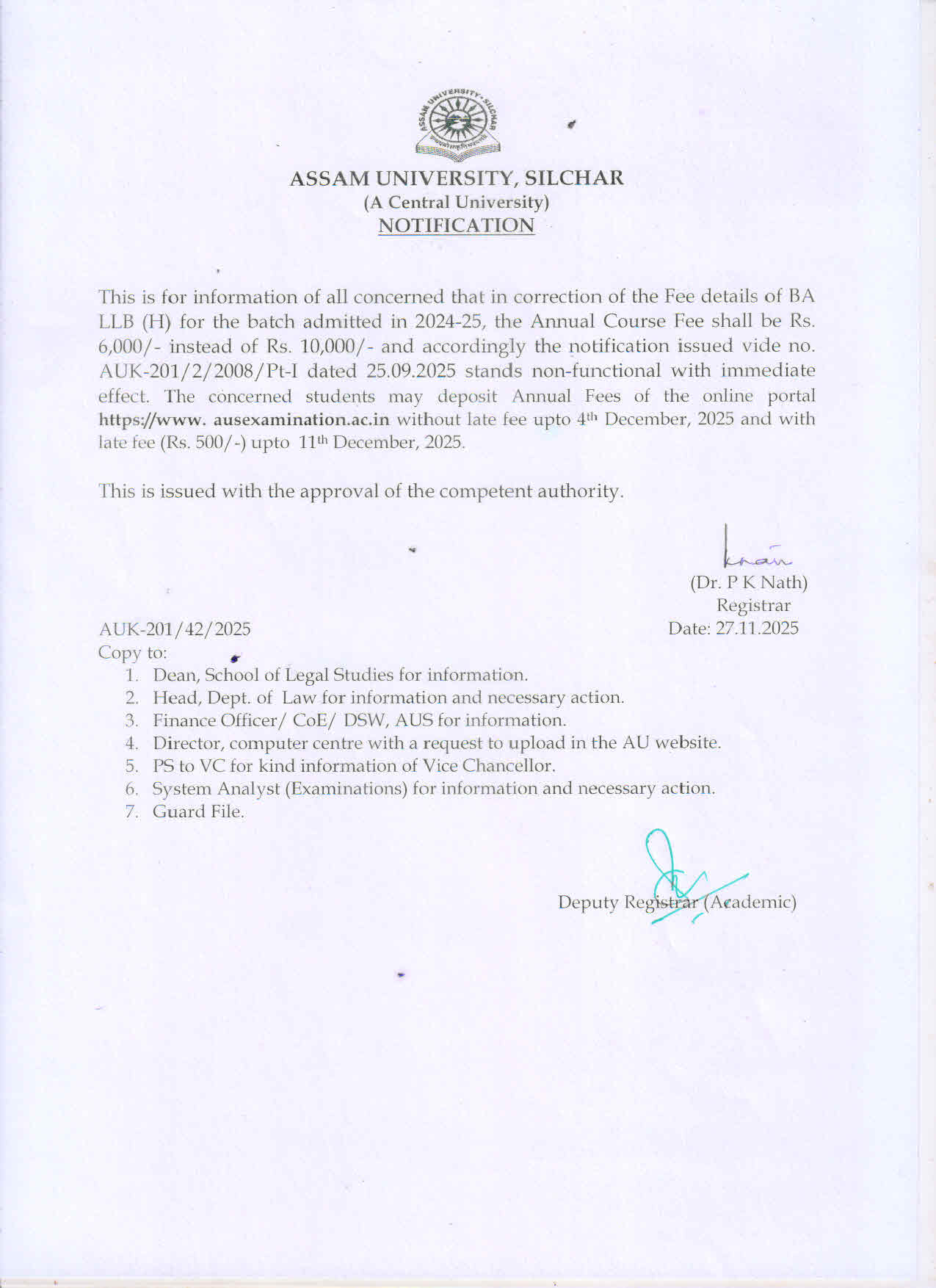 - Notification regarding Annual Course Fees for BALLB (H) 3rd Sem Batch