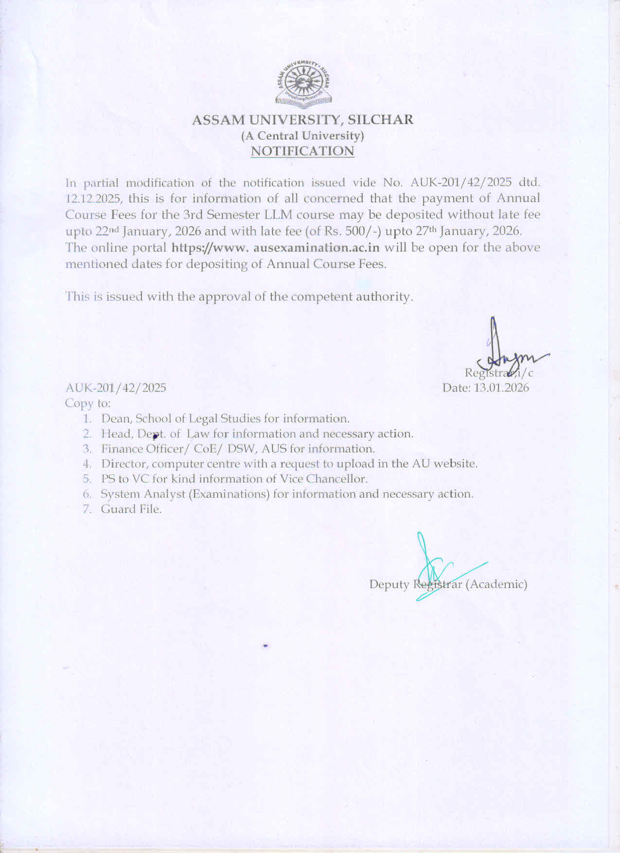 - Notification regarding payment of Annual Course Fees for 3rd Semester LLM course