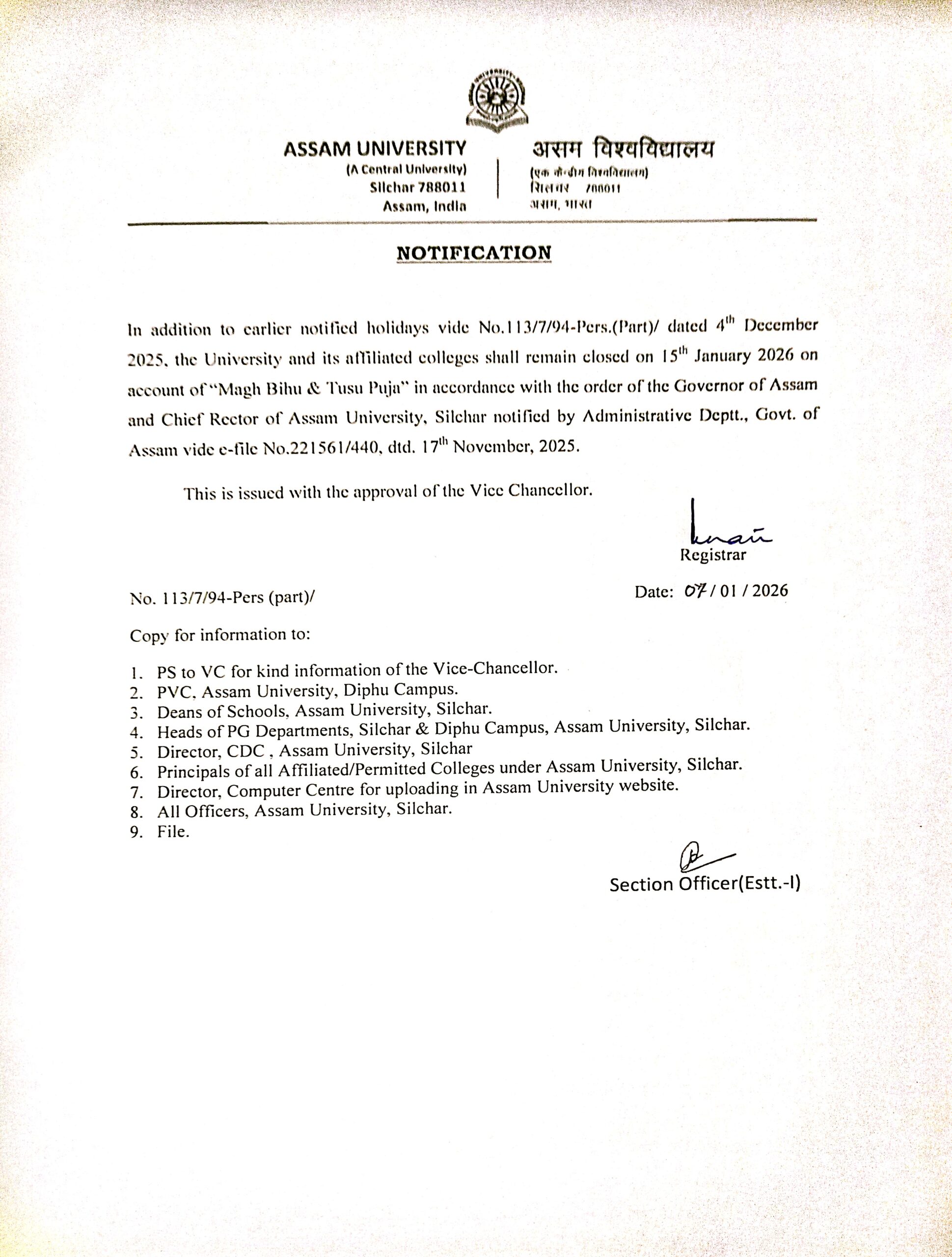 - Notification regarding holiday on 15th January, 2026, on account of “Magh Bihu & Tusu Puja”