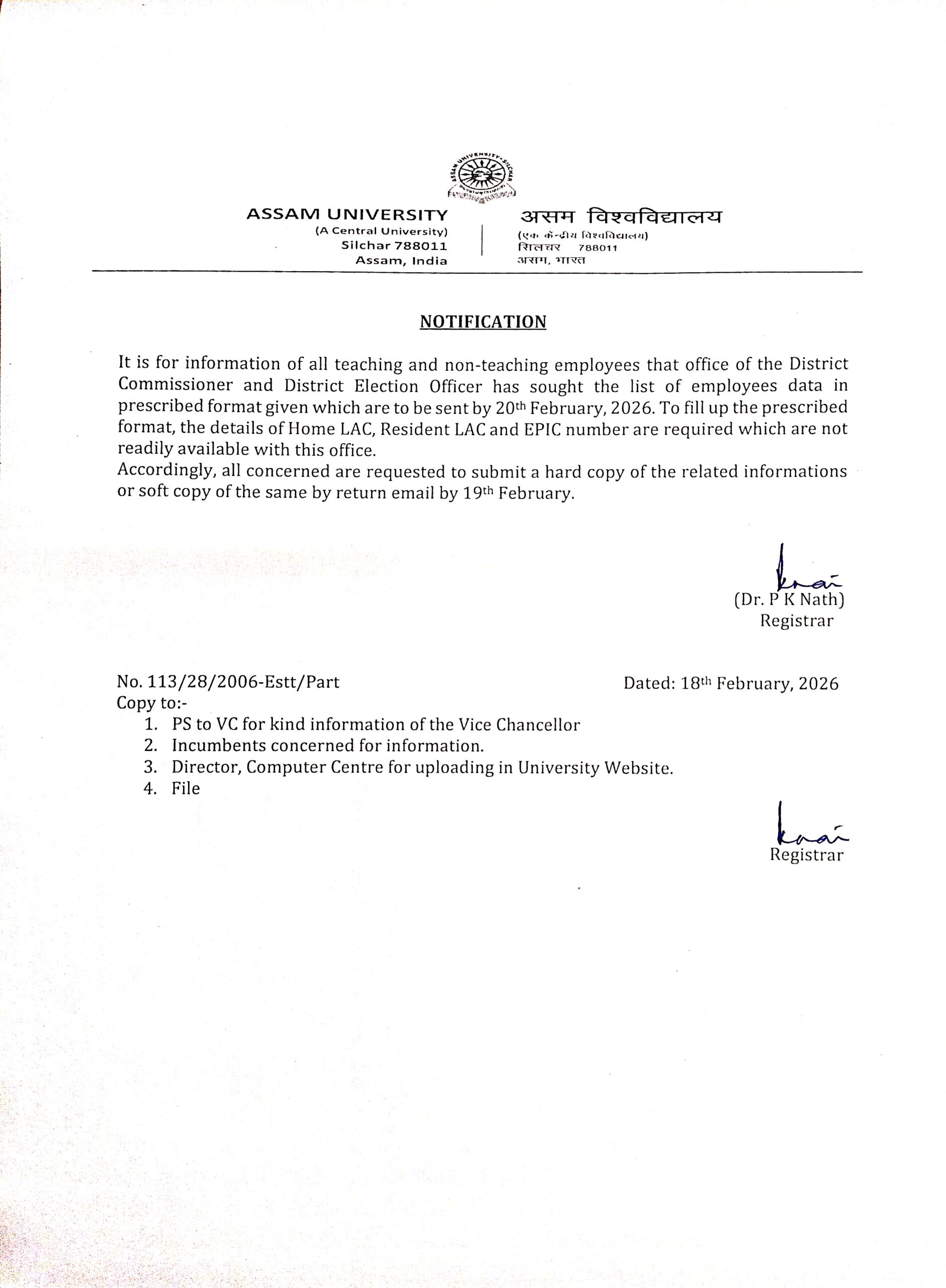 - Notification regarding Hostel Allotment list, Assam University, Silchar